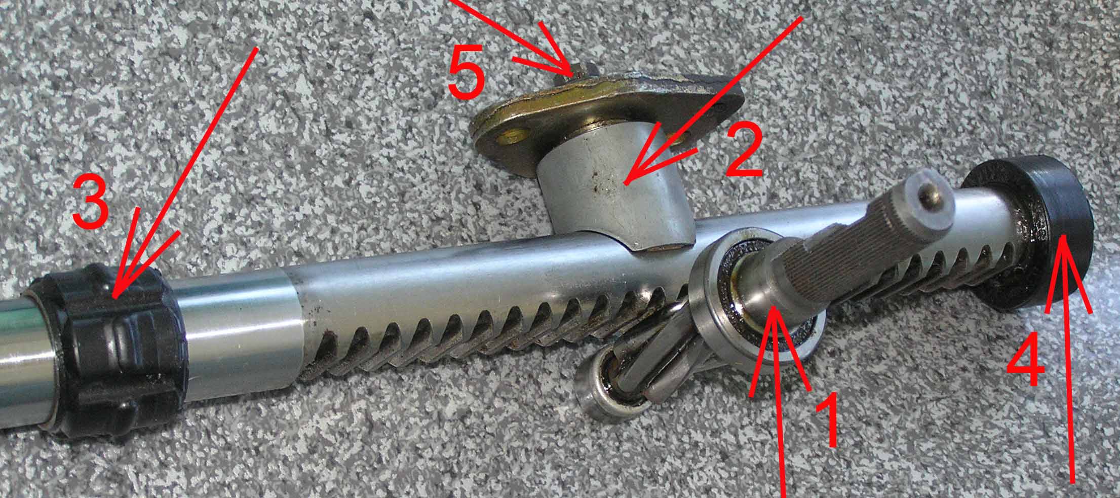 Саня, а вот здесь давай подумаем!!! Вот тебе картинка всей рейки без ГУР. Там нечему ломаться... 1. втулка 3 (про нее мы часто говорим, но там звук то не очень железный будет... люфт в ней даст стук рейка-кольцо втулки, а не по корпусу!) 2. есть еще вкладышь на прижиме 2.. он тоже вынашивается. Вот смотри - болтом 5 я делал только одну регулировку - когда от вала рейки были отсоединены рулевые тяги (я тогда там сайленты менял) я взялся рукой за вал рейки и начал его вращать туда-сюда, вот здесь то и надо поджать болт 5 так, чтобы вал туда-сюда не ходил и чуть поджать - ВСЁ!!! Больше не надо - это обеспечивает полный прижим червяка 1 к зубьям рейки, а то потом возвращаться хреново будет. Ну а дальше надо смотреть..., если ты говоришь, что притягивая рукой стук исчезает, посмотри в каком положении рейки стук крайнее правое или левое??? Может у тебя уже стопор -противовес 4 по корпусу колотит... , а может и сайленты разболтались (хотя вряд ли). Так что при открученном болте 5 нет смысла вооще проверять - конечно там просто болтанка!!!
