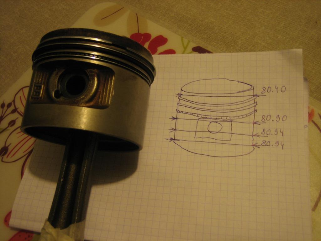 Я тут сносил поршень на работу и там его обмерил откалиброванным микрометром. Удивился. Размеры на картинке. (Помним что спецификация по юбке 80.98 мм с махимальным износом 0.04 мм, т.е. юбка типа должна быть больше 80.94мм). Размеры получились на 40 микрон меньше чем по спецификации (и по штангенциркулю). Оснований не верить микрометру нет: при мне им померили шаблон 85 мм и было РОВНО 85.00 мм. Забавно что видимого износа внизу юбки нет, кольцевые полосочки все видно. Поэтому толи износ какой-то невидимый, толи поршень мой в размерах меняется (от температуры?) толи меньше его на заводе сделали. Только запутался.