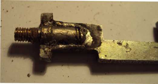 Сань, только перед пайкой контакта с вилки, обязательно, на тяге (штоке), сделай надфелем пропилы с двух сторон, сточи что то на бодобие заточки ножа, что бы контакт не распирало сильно при одевании, и глубину посадки подбери что бы тарелочки оказались как раз там где ранее завальцовывались. Ну что бы общий размер не очень отличался.