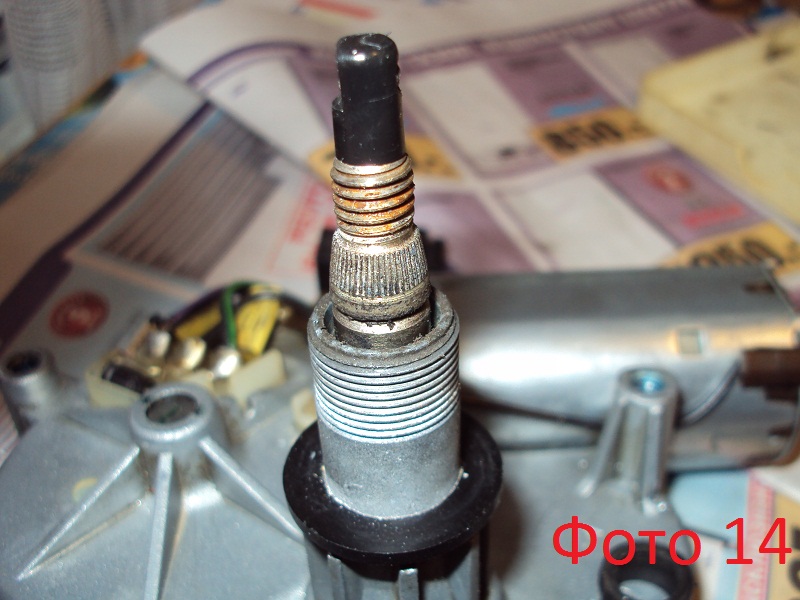 12. Вынимает резиновый сальничек (поз 15, на фото 13 и фото 14) 13. Подеваем отверткой крышку механизма (фото 15) и ……… пытаемся ее снять, но не тут то было. Крышка то пошла сразу, а вот голубенькая трубочка вышла на 1см и далее никак (фото 16). Ее бы покрутить туда сюда, подвигать туда сюда, но крутить не позволяет беленькая пластмаска (поз 16 , на фото 15) . Эта пластмаска, как я понял, как раз и существует для фиксации голубенькой трубки в полом валу и предотвращает вращение голубенькой трубки в те моменты, когда сам полый вал вращается (именно на этот полый вал и насажен сам дворник).