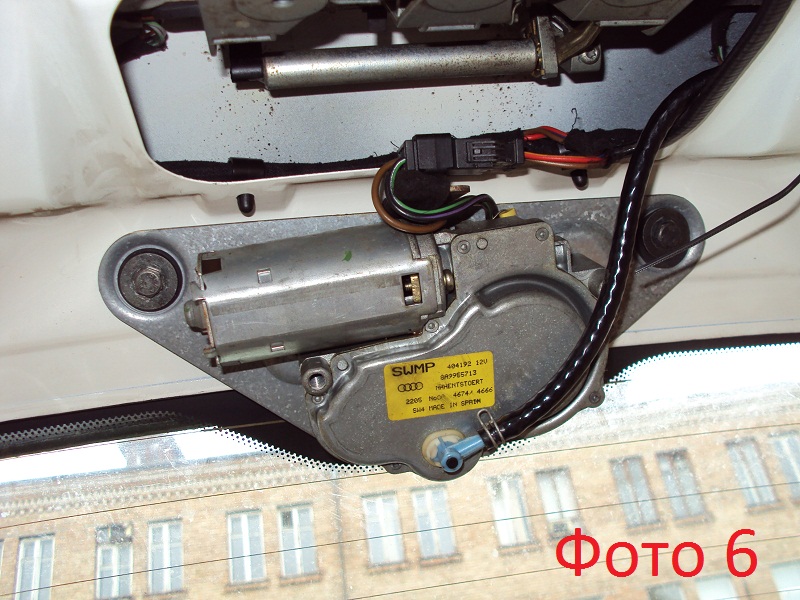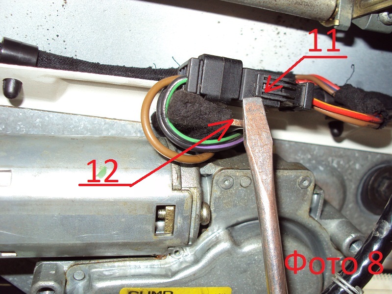 7. Далее отсоединяем трубку подачи омывайки (поз 8, на фото 7) , сначала конечно снимем хомут (поз 10, на фото 7), от той голубенькой трубки (поз 9, на фото 7), которую нам и надо то извлечь потом из полого вала механизма. 8. Отсоединяем разъем (поз 11, на фото 8 ) от механизма и вынимает разъем из кронштейна (поз12, фото 8 ) 9. Ключом на 10 откручиваем два болта (поз 13, на фото 9), которые крепят механизм на двери и снимаем механизм. При этом на внешней стороне может “упасть” вставка (поз 5, на фото 3), не потеряйте ее. В отверстии в стекле двери, остается только резиновая втулка (поз 6, на фото 3). Заклеиваем ее снаружи скочем на случай дождя, а сами с механизмом отправляемся домой.