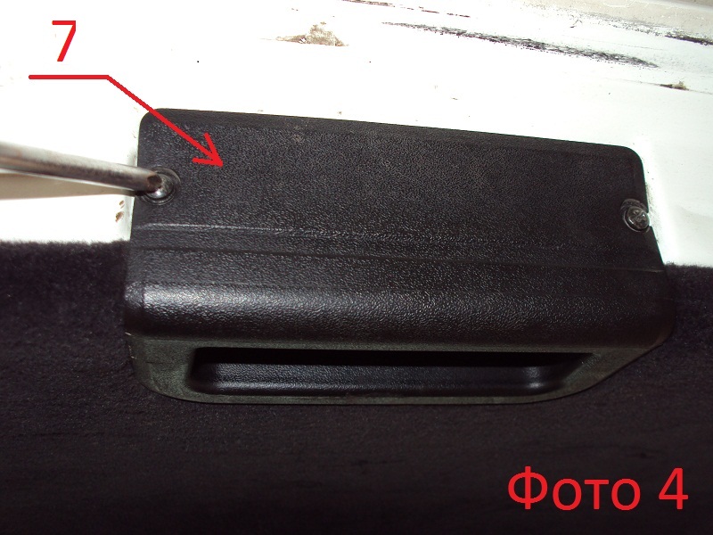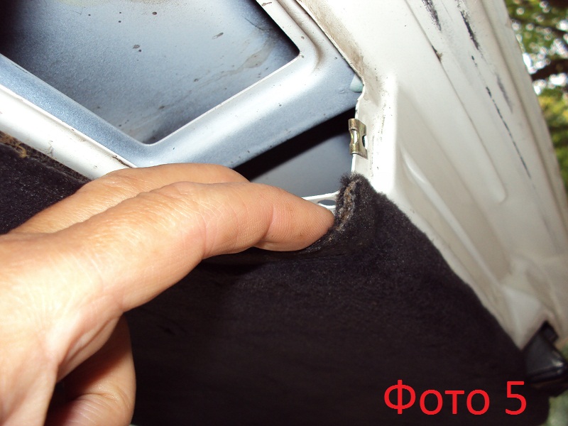 4. Открываем дверь багажника и снимаем внутреннюю ручку задней двери(поз 7, на фото 4). Здесь все просто, всего два самореза. 5. Снимаем внутреннюю обшивку оттягивая ее пальцами и перемещаясь по ее периметру, начиная с проема снятой ручки (фото 5). Только без энтузиазма, она крепится на пластиковых клипсах, их по периметру обшивки по моему 8 шт. (жаль не посчитал). Снятие обшивки обычно не вызывает проблем. Я ее по разным поводам, снимал уже раз пять. 6. Все, механизм перед вами (фото 6)