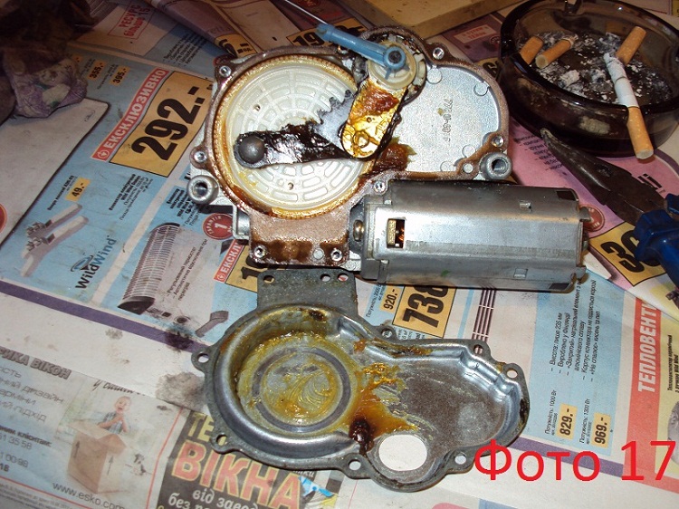 16. Извлечь полый вал, внутри которого стоит голубенькая трубка и сама форсунка, из корпуса механизма оказалось тоже не просто, крутиться он довольно легко(иначе и дворник бы не работал), но вытягиваться, более чем на пару сантиметров, ну никак!!! Опять заливаем масло и путем многократных поворачиваний туда- сюда, разрабатываем его в корпусе. Пять минут стараний, и опять таки, при очень значительном усилии я его все таки вытащил (фото 20).