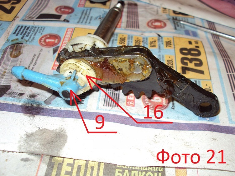 17. Оказалось что внутри корпуса механизма есть сальничек (поз 22, на фото 20), который устанавливается в паз (поз 23, на фото 20) на полом валу (поз 21, на фото 20). Он оказался порванным, очевидно при моих стараниях при снятии вала. Забегая вперед скажу, что не стоит так сильно горевать по этому поводу, там есть основной сальник смотрите (поз 15, на фото 13). Поэтому при сборке механизма я набил туда смазки от души, затем запихал туда же порванное кольцо равномерно по кругу, ведь оно кроме роли сальника, выполняет и роль и поддержки полого вала в корпусе механизма.