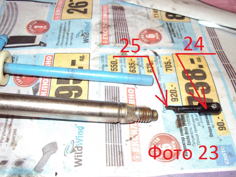 19. Аналогично, но только с помощью плоскогубцев, с другой стороны полого вала извлекаем форсунку (поз 24, на фото 22), руками у меня не получилось даже расшатать ее, так она сильно закисла в полом валу. Потому она и вращалась вместе с полым валом. 20. Когда глянул на форсунку, то стало ясно в чем собственно корень зла. На фото видно что кончик трубки форсунки сломан(поз 25, на фото 23). 21 Далее приступаем к чистке самой голубенькой трубки полого вала, как снаружи так и внутри, отверстия в корпусе механизма, куда вставляется полый вал. Здесь применялись и круглый надфель, и наждачка. Промывал обычной водой. Срани всякой оттуда вывалилось достаточно, в том числе из полого вала вывалились и остатки обломанного конца форсунки, и ……… еще один резиновый сальник (поз 26, на фото 24 ). Сразу я его то и не заметил. Там внутри полого вала есть фаска (меняется диаметр внутреннего отверстия вала) на которую упирается этот сальничек, а в сам этот сальник упирается торец голубенькой трубочки (поз 9, на фото24) , тем самым предотвращая попадания омывайки в полый вал, и далее в сам механизм дворника. Более того, когда устанавливается форсунка, этот сальник дополнительно удерживает и ее. Так что этот сальник довольно многофункциональный.