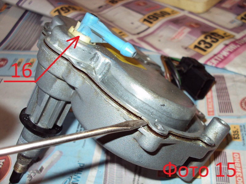 12. Вынимает резиновый сальничек (поз 15, на фото 13 и фото 14) 13. Подеваем отверткой крышку механизма (фото 15) и ……… пытаемся ее снять, но не тут то было. Крышка то пошла сразу, а вот голубенькая трубочка вышла на 1см и далее никак (фото 16). Ее бы покрутить туда сюда, подвигать туда сюда, но крутить не позволяет беленькая пластмаска (поз 16 , на фото 15) . Эта пластмаска, как я понял, как раз и существует для фиксации голубенькой трубки в полом валу и предотвращает вращение голубенькой трубки в те моменты, когда сам полый вал вращается (именно на этот полый вал и насажен сам дворник).