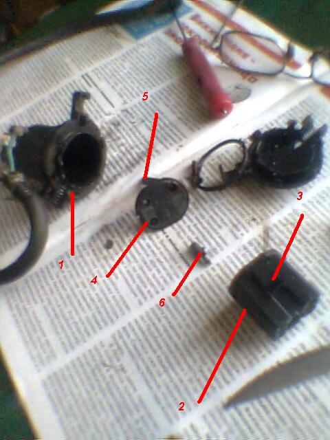 Из корпуса 1 нужно извлечи направляющую 2, для этого по краям нужно отжимать язычки 3 от стенок корпуса. Делал поочереди узеньким ножиком, подсовывая тонкую отвёрку под язычки 3. Для снятия замыкателя 6 нужно нажать выступ в пазу направляющей 2. Контакты протираются, зачищаются. На замыкателе 6 стоит пружинка, которая и выталкивает шток 5 при выключении задней передачи. У меня эта пружинка изоржавела. Вот её и нужно заменить. Деталь 4 - резиновый уплотнитель, защищает контакты от падания масла из кпп.