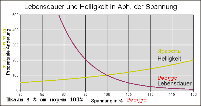 по ресурсу вот табличка по яркости (ось X) и ресурсу (ось Y) лампы накаливания, жёлтая кривая - яркость, красная - ресурс, шкалы в процентах от нормы в 100%, Видно что при увеличении напряжения на 5% ресурс падает вдвое, а на 20% в двадцать раз.